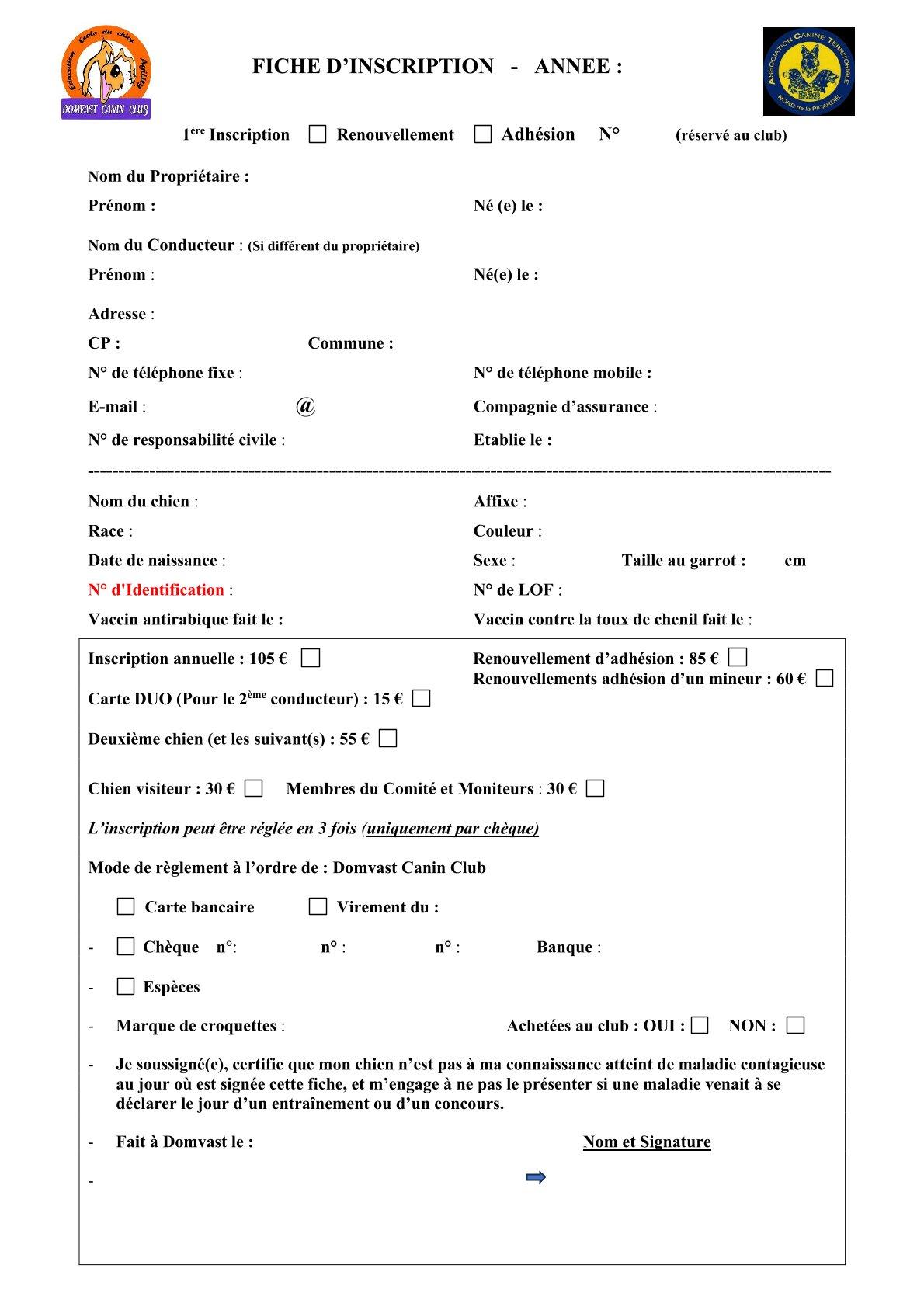 - Permis de détention pour les chiens de 2ème catégorie. (Sauf dérogation, les chiens de 1ère catégorie ne sont pas admis au club)